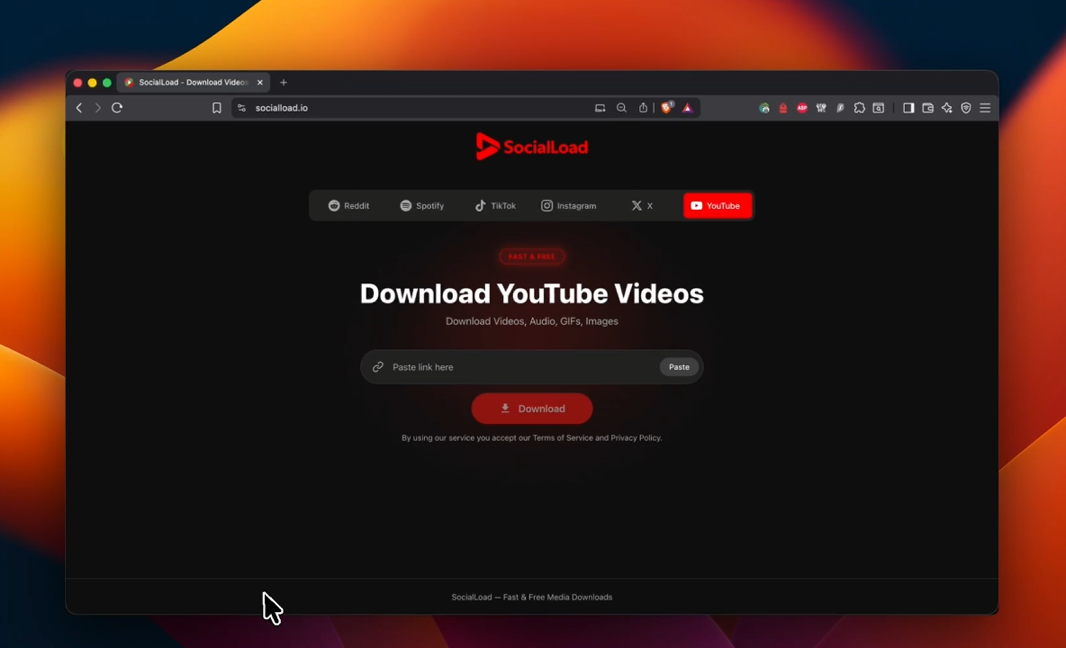Demo of the media downloader — paste a link from YouTube, TikTok, Instagram or Reddit and grab the file in seconds.